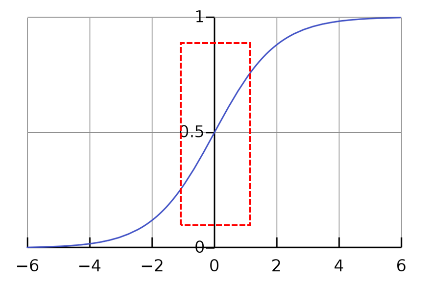 sigmoid에서 빨간 네모 부분에 맞춰 정규화가 되는 것인데, 선형그래프와 유사한 형태를 가진다. 결국 activation function으로 $y=ax$를 쓰는 것과 비슷한 효과가 된다.