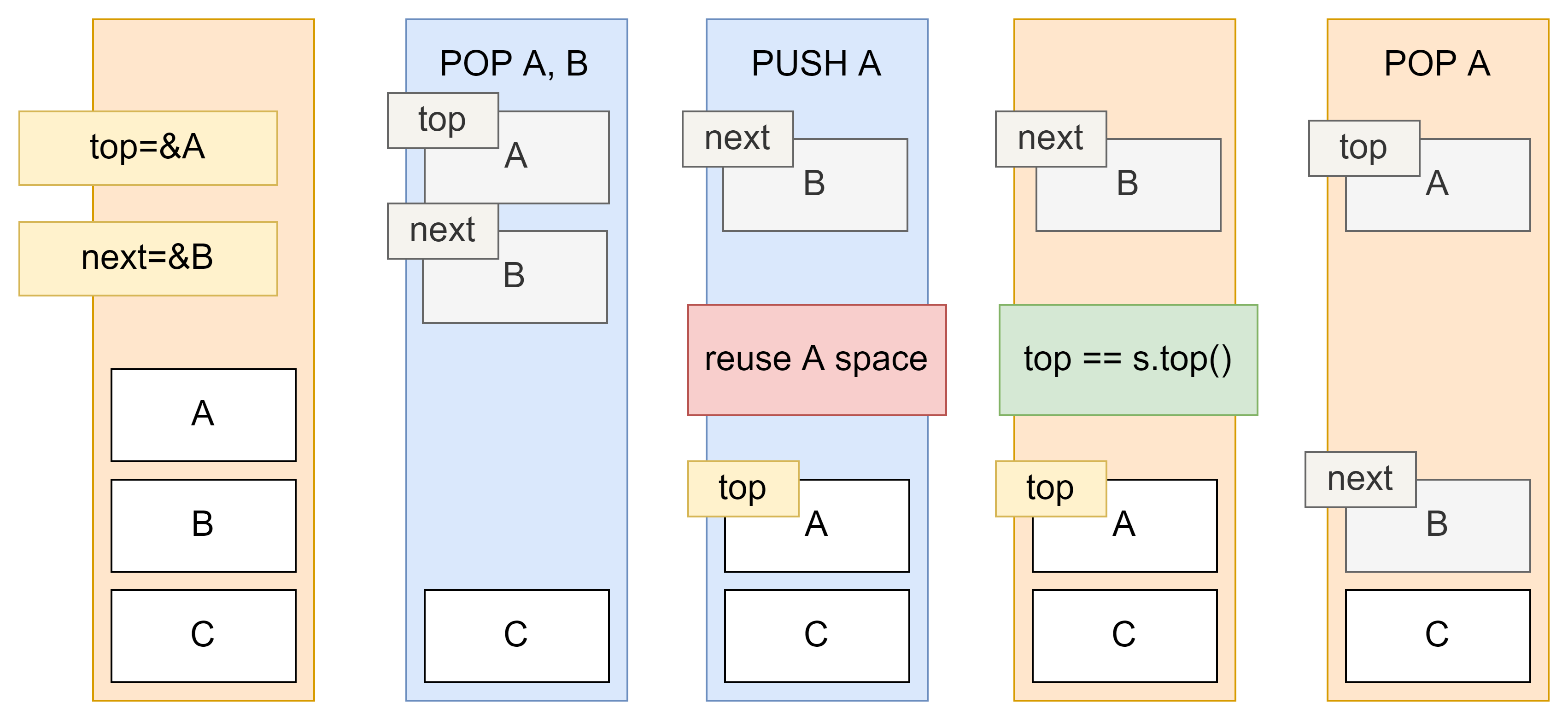 이때 POP A, POP B 부분에서 A와 B의 할당 메모리를 해제한다.