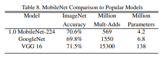 기존 CNN 모델인 VGG-16과 비교해 보면, 먼저 3x3 -> 1x1 필터를 적용한 것을 보아 Mobilenet에서 depthwise separable convolution을 사용한 것을 알 수 있고, pooling을 stride 2로 대신했다.